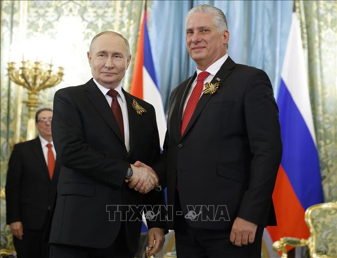 Tổng thống Nga Vladimir Putin (trái) và Chủ tịch Cuba Miguel Diaz-Canel trong cuộc gặp ở Moskva. Ảnh tư liệu: AFP/TTXVN